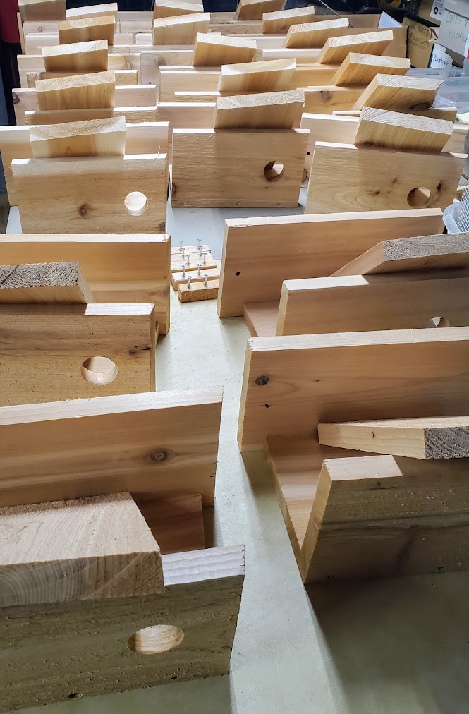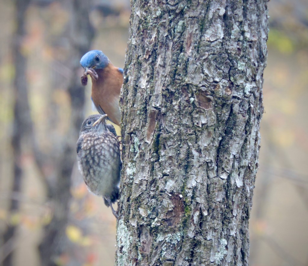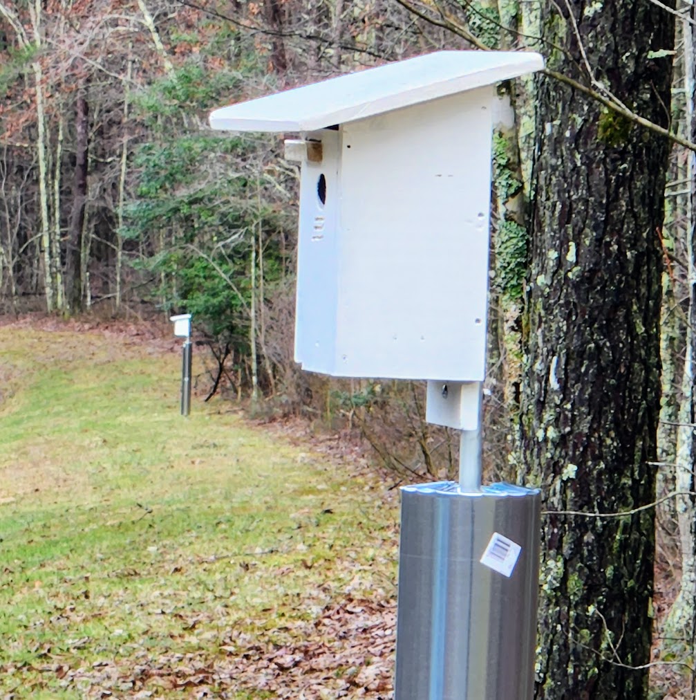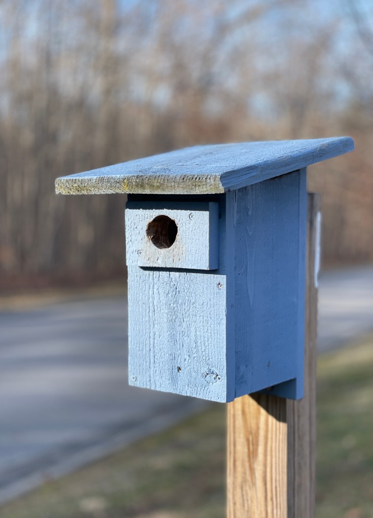 Nest box assembly line (D. Hazel)Nest box trail (D. Hazel)Nest box (M. Bayless)Feed me! (M. Bayless)Mealworm snack (B. Merrick)Feeding a fledgling (M. Bayless)Winter bluebird (D. Hazel)Go forth! (B. Merrick)Monitors on the Brae (D. Hazel)